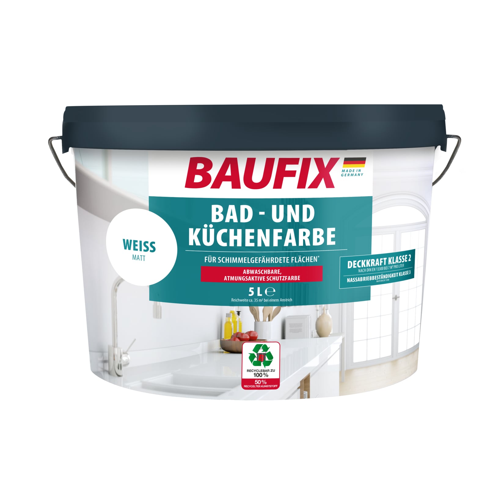 Träumst Du von einem strahlend weißen Bad, das Ruhe und Reinheit ausstrahlt? Oder einer Küche, in der das Kochen noch mehr Freude bereitet, weil alles sauber und einladend wirkt? Mit der BAUFIX Bad- und Küchenfarbe in edlem Mattweiß kannst Du diese Träume ganz einfach und kostengünstig verwirklichen! Diese hochwertige Farbe bietet nicht nur ein wunderschönes, zeitloses Finish, sondern auch einen zuverlässigen Schutz vor den besonderen Herausforderungen, denen Wände in Feuchträumen ausgesetzt sind.