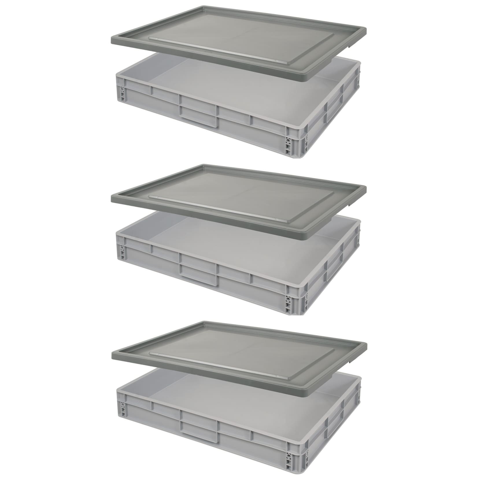 Dieses Set beinhaltet mehrere Euro-Stapelbehälter mit den Maßen 80 x 60 x 12 cm. Diese standardisierten Abmessungen ermöglichen eine optimale Nutzung von Lagerflächen und Regalsystemen. Die Behälter sind stapelbar, was zusätzlichen Platz spart und den Transport vereinfacht. Hergestellt aus hochwertigem Kunststoff, sind diese Behälter äußerst widerstandsfähig gegen Stöße, Feuchtigkeit und Temperaturschwankungen. Sie sind lebensmittelecht und somit auch für die Lagerung von Lebensmitteln geeignet.