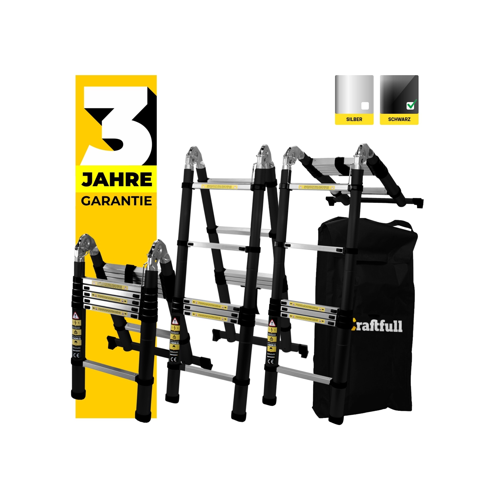 Erleben Sie mit der Craftfull CF-102A Black Edition eine neue Dimension der Flexibilität und Sicherheit bei allen Arbeiten in der Höhe. Diese innovative Klapp-Teleskopleiter vereint die Vorteile einer Anlegeleiter mit denen einer Klappleiter und bietet Ihnen so maximale Vielseitigkeit für unterschiedlichste Einsatzbereiche. Ob im Haus, im Garten, in der Werkstatt oder auf der Baustelle – die CF-102A Black Edition ist Ihr zuverlässiger Partner für jede Herausforderung. Lassen Sie sich von ihrer durchdachten Konstruktion, ihrer hochwertigen Verarbeitung und ihrem eleganten Design begeistern!