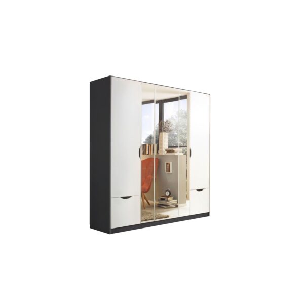 Verwandle dein Schlafzimmer in eine Wohlfühloase mit dem Drehtürenschrank Laura. Dieser elegante Schrank in harmonischem Grau und Weiß bietet nicht nur viel Stauraum, sondern ist auch ein echter Blickfang. Mit seinen 5 Türen und einer Breite von 181 cm fügt er sich nahtlos in jedes Raumkonzept ein und sorgt für Ordnung und Stil.