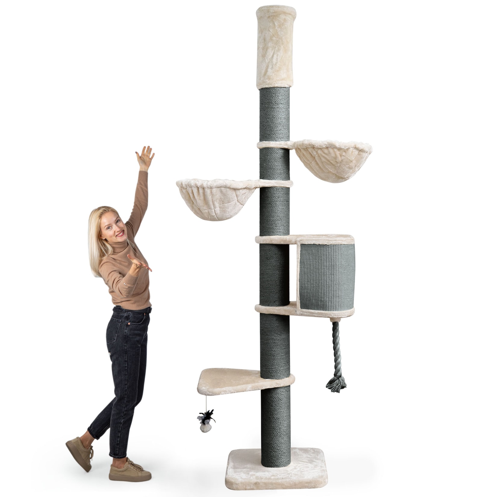 Mit einer Höhe von 250 bis 275 cm bietet der Kratzbaum ausreichend Platz zum Klettern, Kratzen, Spielen und Entspannen. Die verschiedenen Ebenen, Höhlen und Liegeflächen laden zum Erkunden und Verweilen ein. Ihre Katze kann sich nach Herzenslust austoben, ihre Krallen pflegen und den Überblick über ihr Reich behalten.