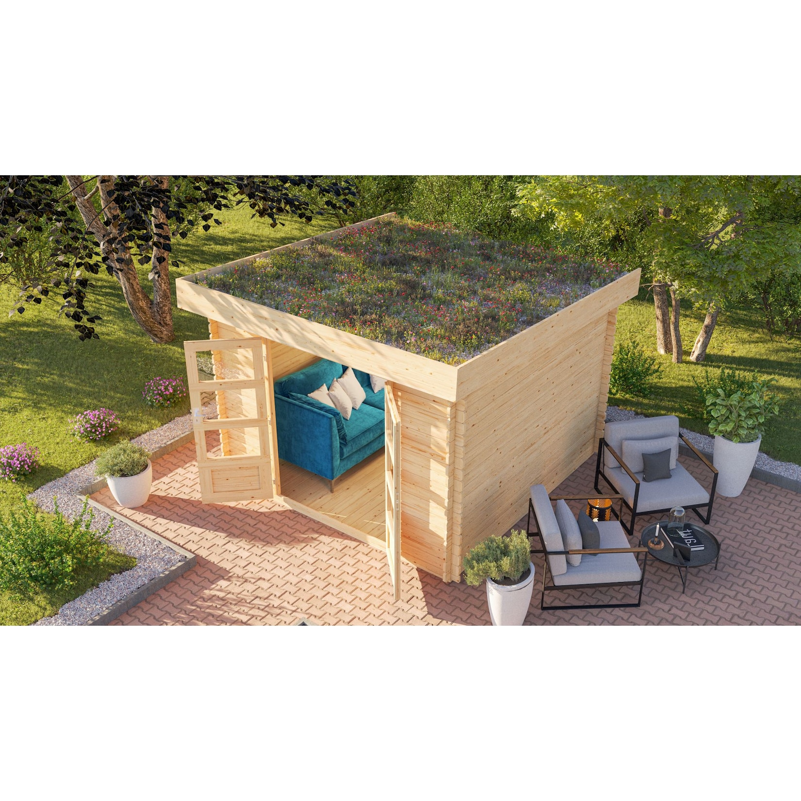 Die präzise Verarbeitung der Blockbohlen und die passgenauen Verbindungen garantieren eine hohe Stabilität und Langlebigkeit des Gartenhauses. Das stabile Dach bietet zuverlässigen Schutz vor Wind und Wetter, während die optionale Dachbegrünung nicht nur optisch ein Highlight ist, sondern auch zur Verbesserung des Mikroklimas beiträgt und die Lebensdauer des Daches verlängert.