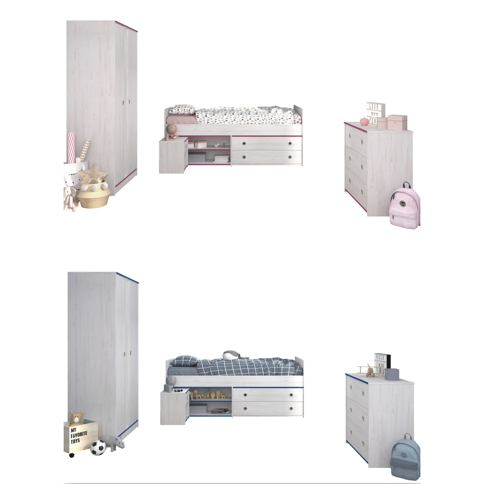 - Komplett-Set: Bett, Kleiderschrank, Kommode und Nachtkommode in einem