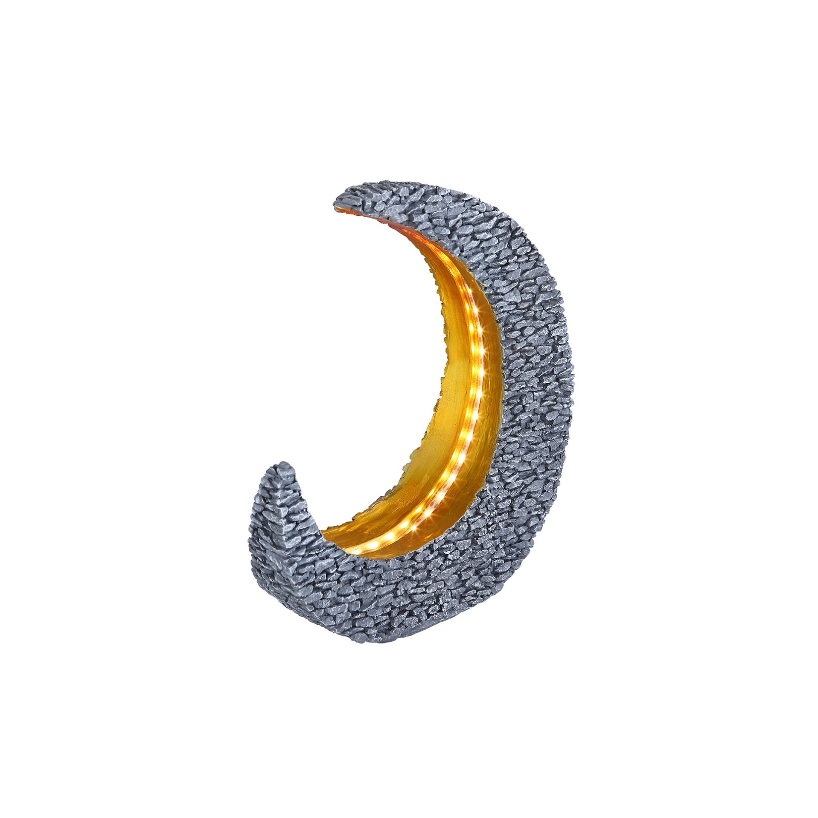 Die LED Solarleuchte im Mond Design besticht durch ihre detailreiche Gestaltung und die harmonische Kombination aus steingrauem und goldenem Finish. Die Oberfläche ist mit einer feinen Struktur versehen, die an die Oberfläche des Mondes erinnert und der Leuchte eine natürliche und authentische Anmutung verleiht. Das goldene Innere des Mondes reflektiert das Licht auf eine Weise, die eine warme und einladende Atmosphäre schafft.