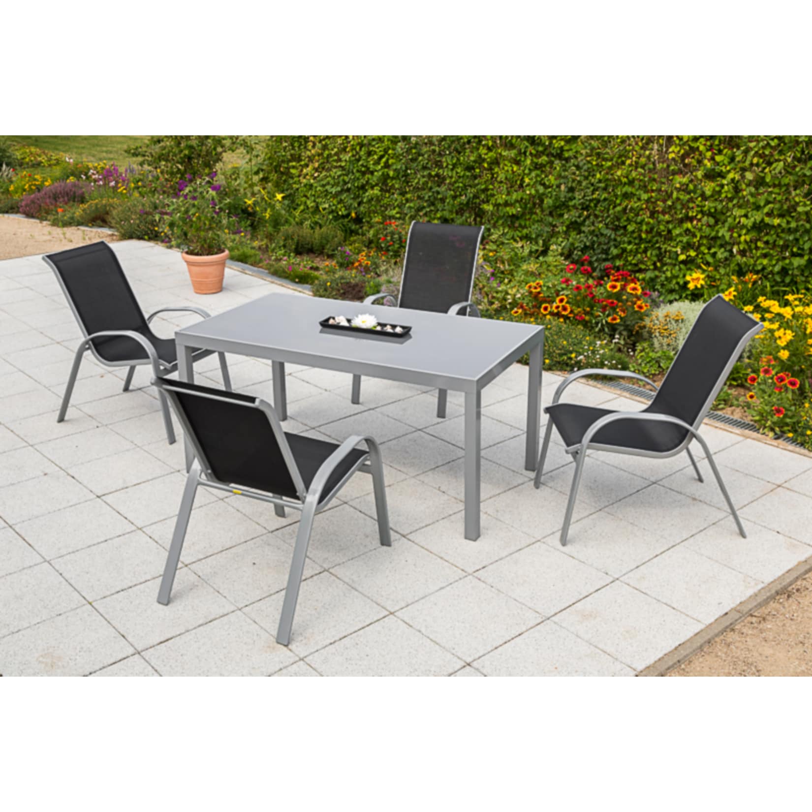Verwandeln Sie Ihren Garten, Ihre Terrasse oder Ihren Balkon in einen einladenden Treffpunkt für Familie und Freunde mit der Merxx Tischgruppe Amalfi. Dieses 5-teilige Set vereint zeitloses Design mit hochwertigen Materialien und schafft so einen stilvollen Mittelpunkt für unvergessliche Momente im Freien. Die elegante schwarze Farbgebung fügt sich harmonisch in jede Umgebung ein und verleiht Ihrem Outdoor-Bereich eine edle Note. Genießen Sie entspannte Stunden beim Grillen, Kaffeetrinken oder einfach nur beim Verweilen im Freien – die Merxx Tischgruppe Amalfi bietet den perfekten Rahmen dafür.