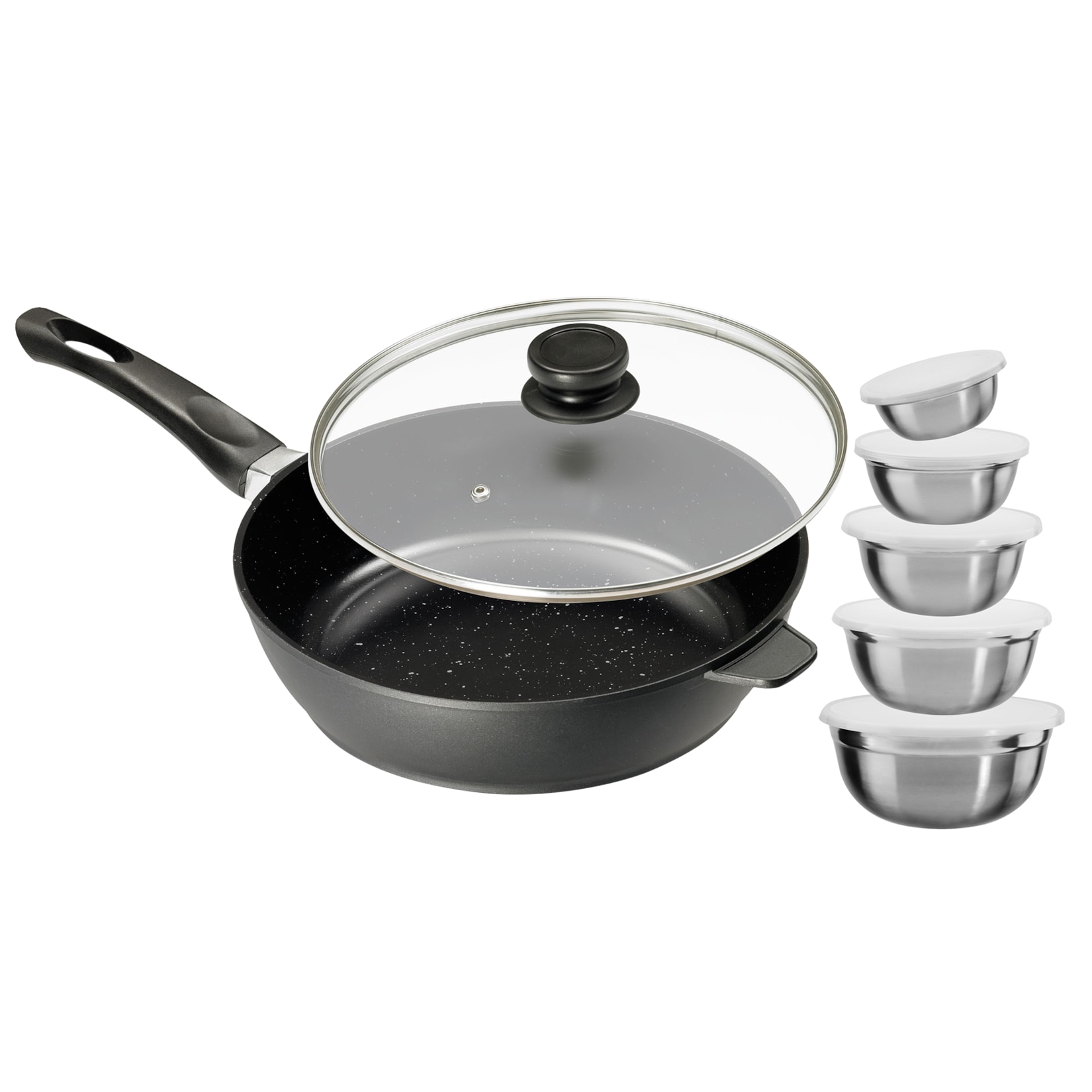 Das mitgelieferte Schüsselset ist die perfekte Ergänzung zur KING® KERAMIK Bratpfanne. Die fünf Schüsseln in den Größen Ø12, Ø14, Ø16, Ø18 und Ø20 cm bieten Ihnen unzählige Möglichkeiten in der Küche. Ob zum Vorbereiten von Zutaten, zum Anrühren von Teigen oder zum Servieren von Salaten – dieses Set ist ein unverzichtbarer Helfer.