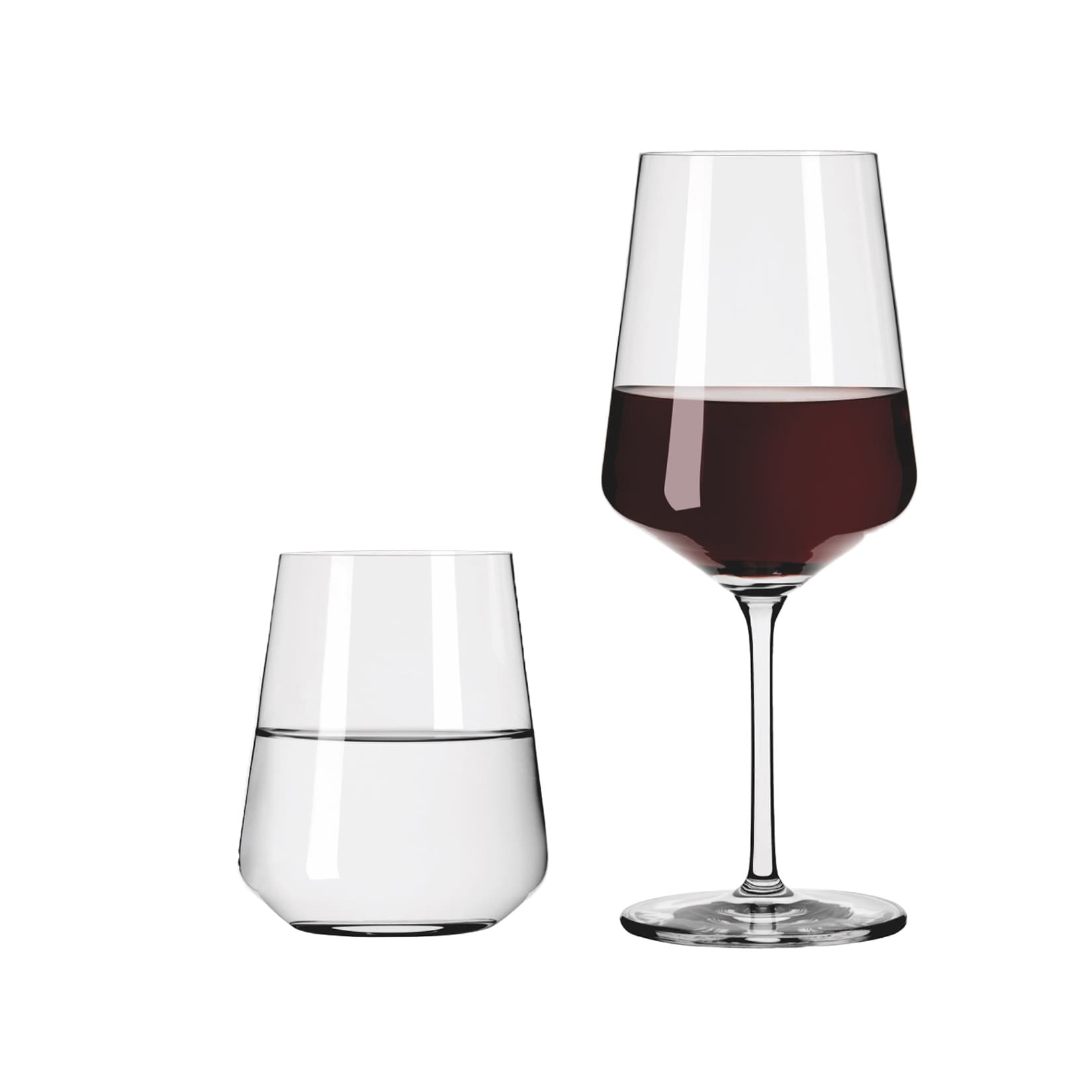 Das Set enthält 6 Rotweingläser und 6 Wassergläser. Die Rotweingläser sind speziell für die Entfaltung komplexer Aromen konzipiert, während die Wassergläser mit ihrer schlichten Eleganz universell einsetzbar sind.