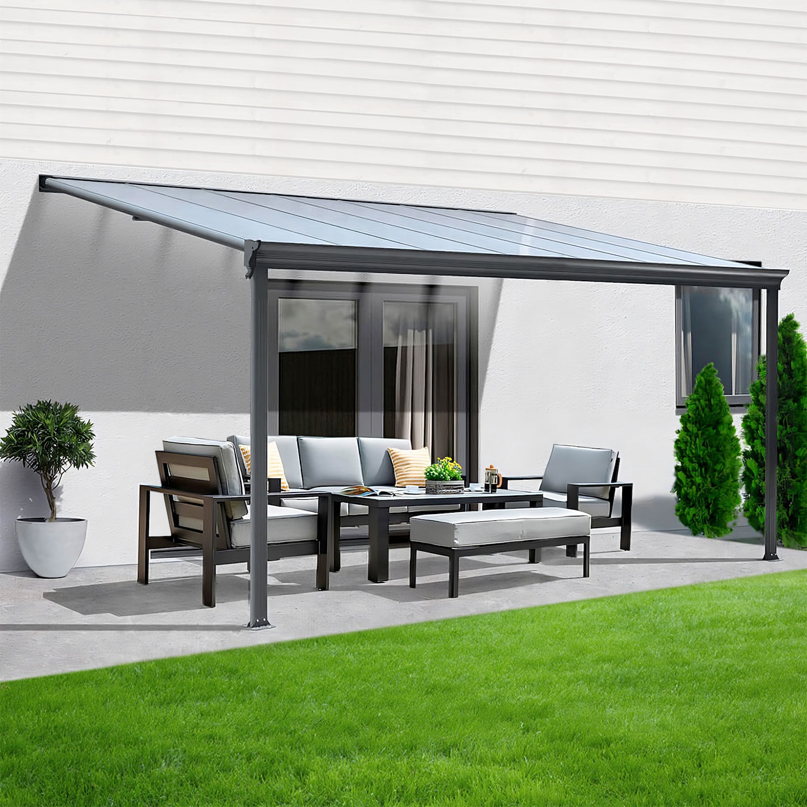 Stellen Sie sich vor, wie Sie unter Ihrer neuen Terrassenüberdachung sitzen, geschützt vor den Elementen, und die Natur genießen. Ob ein entspanntes Frühstück im Freien, ein gemütlicher Grillabend mit Freunden oder einfach nur ein ruhiger Moment, um ein Buch zu lesen – Ihre Terrasse wird zu einem Ort der Entspannung und des Wohlbefindens. Die graue Farbgebung unserer Terrassenüberdachung fügt sich harmonisch in jede Umgebung ein und verleiht Ihrem Außenbereich eine moderne und stilvolle Note. Kombinieren Sie die Überdachung mit passenden Gartenmöbeln, Pflanzen und Accessoires, um Ihre persönliche Wohlfühloase zu schaffen.