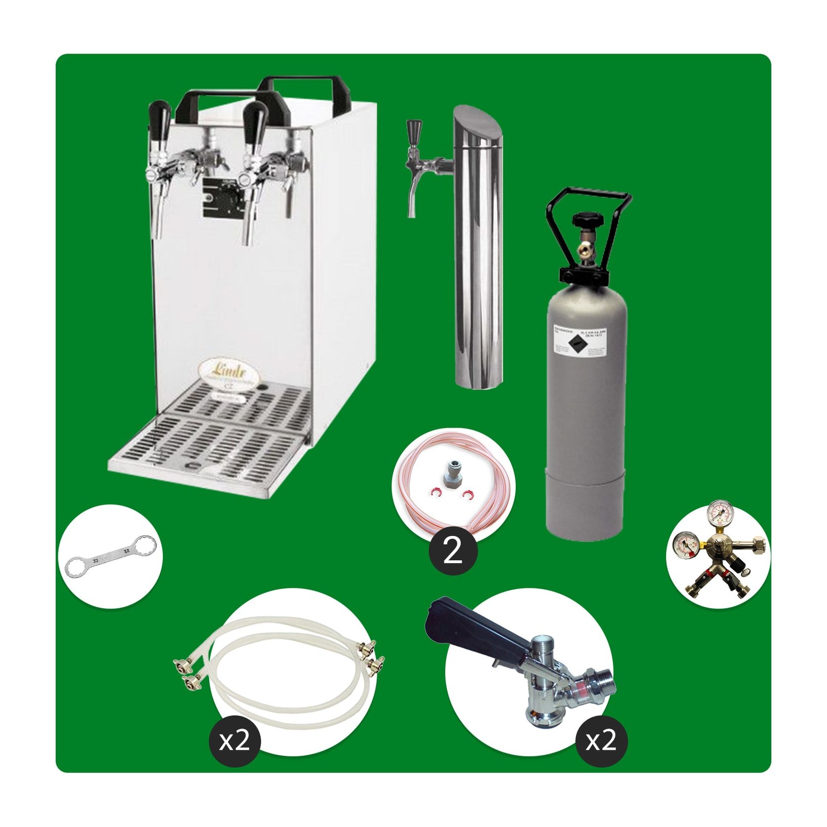 Im Zentrum dieses Komplettsets steht die Kontakt 40 2-leitig Trockenkühler Bierzapfanlage der Green Line. Diese Zapfanlage überzeugt nicht nur durch ihre Leistung, sondern auch durch ihre Umweltfreundlichkeit. Die Green Line steht für energieeffiziente Technologie, die dir ermöglicht, Bier zu zapfen, ohne unnötig Energie zu verschwenden. Mit einer Zapfkapazität von 50 Litern pro Stunde bist du bestens gerüstet, auch wenn es mal etwas mehr zu feiern gibt.