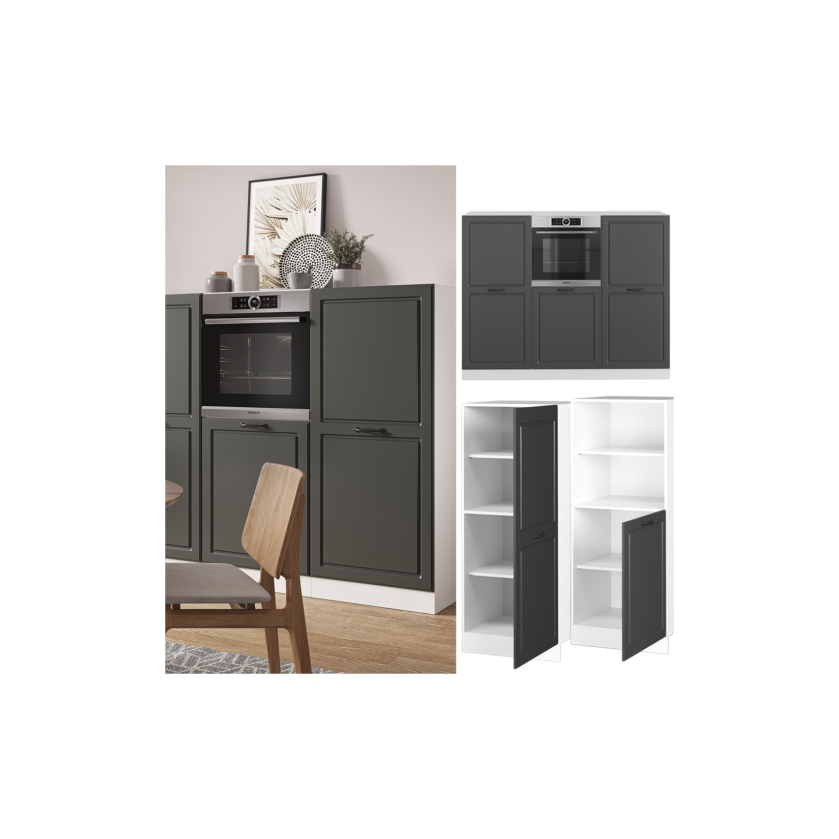 Die geräumigen Schränke und Schubladen bieten viel Stauraum für Geschirr, Töpfe und Pfannen. Dank der leichtgängigen Auszüge haben Sie jederzeit alles griffbereit. Die Arbeitsplatte ist robust und pflegeleicht und bietet ausreichend Platz zum Vorbereiten und Anrichten Ihrer Speisen.