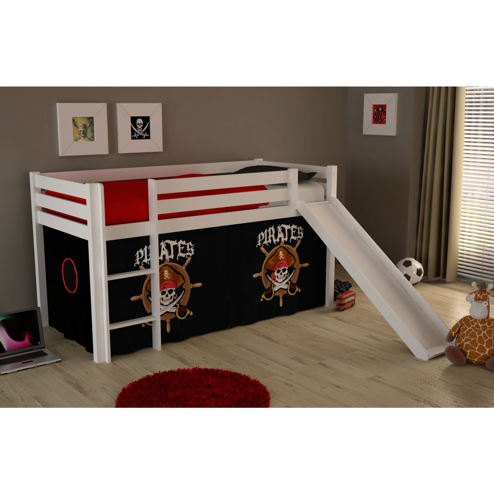 Das Design des Spielbettes ist kindgerecht und sicher. Abgerundete Kanten und eine stabile Leiter sorgen für ein gefahrloses Auf- und Absteigen. Die Rutsche ist ein absolutes Highlight und bietet zusätzlichen Spaß. Das Textilset „Pirates“ mit seinen farbenfrohen Motiven und liebevollen Details verwandelt das Bett in ein echtes Piratenschiff.